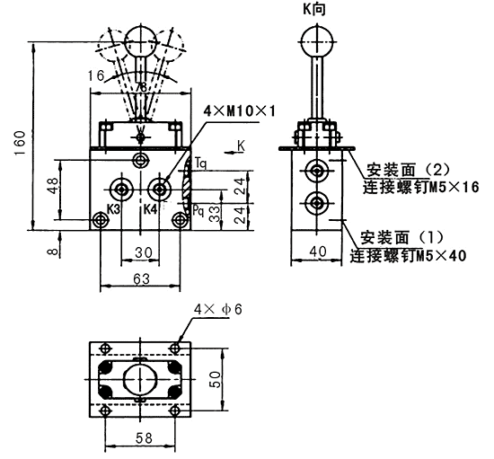 用途與特征: 2KQF型操縱氣閥是切換多路氣控閥氣缸的操縱氣閥。搬動(dòng)手柄可在二個(gè)不同位置分別控制多路閥工作。具有其重量輕,體積小,對環(huán)境無(wú)污染,靈敏度高得多等優(yōu)點(diǎn)。是5噸位以上自卸汽車(chē)氣路控制的一種理想元件。2KQF型操縱氣閥的原始位置Pq口與T口是封閉的,各控制口K與Tq口相通。搬動(dòng)手柄可在二個(gè)不同角度。