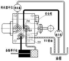 35SZH型組合閥用于備胎架液壓系統的升降控制時(shí),P口與轉向助力泵出油口連接,P1口與轉向器進(jìn)油口連接,A口接備胎架油缸小腔,B口接備胎架油缸大腔,T口接轉向系統油箱。通過(guò)操縱該閥手柄桿,控制油缸伸出或退回,實(shí)現對備胎架升降的控制。該閥的工作原理示意圖如下: