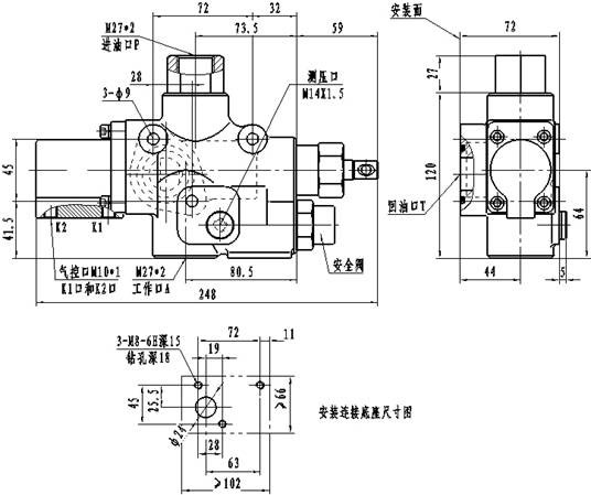 工作原理及圖形符號: 操縱氣閥使壓縮空氣進(jìn)入HLQ-L20H型氣動(dòng)控制閥氣缸體K1口時(shí),壓縮空氣通過(guò)氣缸活塞推動(dòng)閥芯移動(dòng),進(jìn)油口P與工作油口A(yíng)接通,壓力油從P口經(jīng)過(guò)A口進(jìn)入舉升缸,使車(chē)廂開(kāi)始舉升;操縱氣閥切斷壓縮空氣進(jìn)入HLQ-L20H型氣動(dòng)控制閥氣缸體時(shí),該閥閥芯在彈簧力作用下回到中位,壓力油從P口經(jīng)過(guò)T口回油箱,停止向舉升缸供油,車(chē)廂中停;操縱氣閥使壓縮空氣進(jìn)入HLQ-L20型氣動(dòng)控制閥氣缸體K2口時(shí),壓縮空氣通過(guò)氣缸活塞拉動(dòng)閥芯移動(dòng),壓力油從P口經(jīng)過(guò)T口回油箱的同時(shí),舉升缸的液壓油也從A口經(jīng)過(guò)T口回油箱,車(chē)廂在自重的作用下開(kāi)始下降。