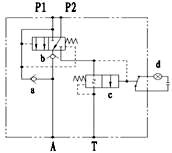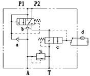 3.當轉向液壓系統助力泵出現故障或在行駛過(guò)程中發(fā)動(dòng)機突然停止工作時(shí),無(wú)轉向壓力油從P1口進(jìn)入應急閥。這時(shí)應急閥主閥芯在彈簧力作用下復位,主閥芯和背壓閥c同時(shí)關(guān)閉;瞬間則由應急泵提供壓力油通過(guò)單向閥b(此時(shí)單向閥a關(guān)閉)分配到A口,壓力油經(jīng)P2→b→A口流出進(jìn)入液壓轉向器的分配閥使其正常工作,驅動(dòng)液壓轉向器的活塞運動(dòng)從而達到應急轉向的目的。
