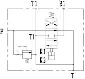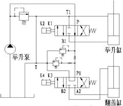 在舉升過(guò)程中,舉升泵輸入的液壓油全流量進(jìn)入舉升缸;在頂蓋開(kāi)啟、關(guān)閉過(guò)程中,舉升泵輸入的液壓油經(jīng)過(guò)分流閥后,分流出一部分(30L/min)進(jìn)入頂蓋油缸,其余的液壓油流回油箱。