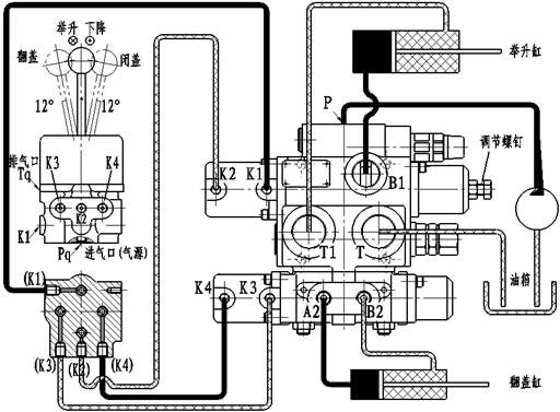 舉升泵供油進(jìn)入QDF-L20型氣控多路閥后,通過(guò)操作氣控操作閥不同位置,讓壓縮空氣分別進(jìn)入該閥所帶氣缸,當推動(dòng)舉升閥閥芯時(shí),可實(shí)現車(chē)箱舉升、中停、下降等功能;當推動(dòng)換向閥閥芯時(shí),可實(shí)現車(chē)箱頂蓋開(kāi)啟、閉合等功能。