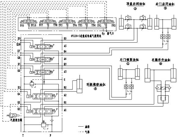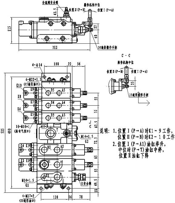 工作泵(舉升泵)供油進(jìn)入QSF-L20H型組合換向閥后,通過(guò)氣控(手動(dòng))操作換向閥切換油路,實(shí)現對不同執行元件(油缸)的控制。當執行元件(油缸)需要大流量的液壓油進(jìn)行工作時(shí),用油管與該組合閥中進(jìn)油閥體與分流閥體之間的換向閥體進(jìn)行連接,工作泵(舉升泵)輸出的液壓油將全流量通過(guò)換向閥進(jìn)入執行機構(油缸);當執行元件(油缸)需要小流量的液壓油進(jìn)行工作時(shí),用油管與該組合閥中分流閥體后面的換向閥體進(jìn)行連接,工作泵(舉升泵)輸入的液壓油經(jīng)分流閥后分流出一部分(30L/Min)通過(guò)換向閥進(jìn)入執行機構(油缸),剩余的液壓油直接流回油箱。