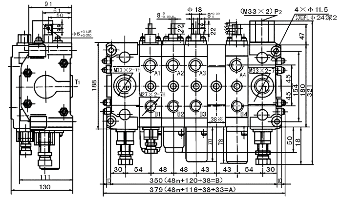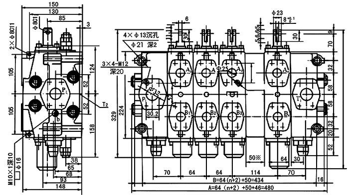 DC20型多路閥的外形及安裝連接尺寸: