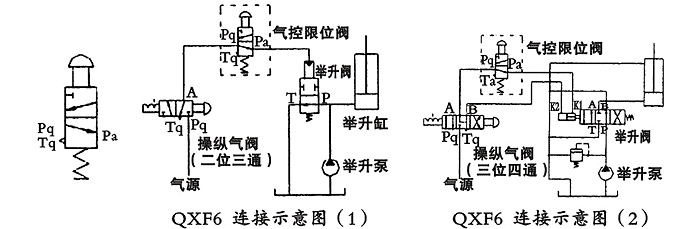 用途與特征: QXF6型氣控限位閥是二位三通型的氣動(dòng)元件,以壓縮空氣為工作介質(zhì),在各種自卸車(chē)的控制氣路中它與舉升閥的控制氣缸管路串接在一起使用,是自卸車(chē)舉升至極限位置時(shí)起限位作用控制閥。 QXF6型氣控限位閥的原始位置Pq口與Pa口是連通的(常開(kāi)式結構)。在連接示意圖(1)中搬動(dòng)操縱氣閥的手柄換向至工作位置(Pq口與A口連通)將壓縮空氣經(jīng)氣控限位閥進(jìn)入舉升閥氣缸使舉升閥換向實(shí)現液壓缸上升。當車(chē)廂舉升到最大轉角位置時(shí),限位機構將氣控限位閥的限位桿壓下切斷其進(jìn)氣口(Pq口與Pa口是斷開(kāi)),Pa口與Tq口接通使舉升閥氣缸內的壓縮空氣由氣控限位閥排入大氣。這時(shí)舉升閥P口與T口瞬間連通,舉升缸即下降一段距離(車(chē)廂舉升轉角變小),隨車(chē)廂舉升轉角變小氣控限位閥的限位桿恢復原始狀態(tài)同時(shí)壓縮空氣經(jīng)該閥再次進(jìn)入舉升閥氣缸使舉升缸,上升(車(chē)廂再次舉升到最大轉角位置)。 在氣控限位閥的限位桿行程范圍內(即Pa口的閉合開(kāi)啟閉合)實(shí)現車(chē)廂下降舉升下降往復變化過(guò)程,使車(chē)廂產(chǎn)生輕微抖動(dòng)有利于將車(chē)廂內的殘留物體卸掉。在連接示意圖(2)中搬動(dòng)操縱氣閥的手柄換向至工作位置(Pq口與A口連通)將壓縮空氣經(jīng)氣控限位閥進(jìn)入舉升閥的氣缸K1口實(shí)現液壓缸上升。當車(chē)廂舉升到最大轉角位置時(shí),限位機構將氣控限位閥的限位桿壓下切斷其進(jìn)氣口(Pq口與Pa口是斷開(kāi)),Pa口與Tq口接通使舉升閥氣缸內的壓縮空氣由氣控限位閥排入大氣。這時(shí)舉升閥回到中位,P口經(jīng)B口與T口連通回油,A口關(guān)閉車(chē)廂處于最高舉升位置狀態(tài)。